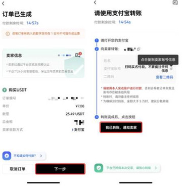 订单确认之后,点击【下一步】;及时打开手机银行App/支付宝/微信,输入对方账户信息进行付款,完成之后,点击【我已转账,通知卖家】。对方核实款项后,您所购买的数字资产就会发放给您,可以在【资产】栏查看。