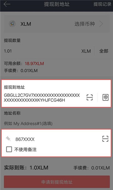 3、点击提现,选择“提现到地址”,进入提现页面,输入您的XLM提币地址,和需要备注的Memo以及提现金额; (注意:不要勾选“不使用备注”)