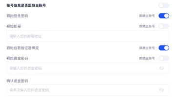 ④选择账号信息是否跟随主账号。如果不跟随,可以选择不跟随主账号的项目并填写新信息。