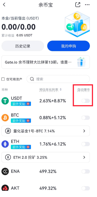 gate.io交易平台余币宝自动赚币这个功能是可以随时开启或关闭的,下面看一下具体的操作流程: