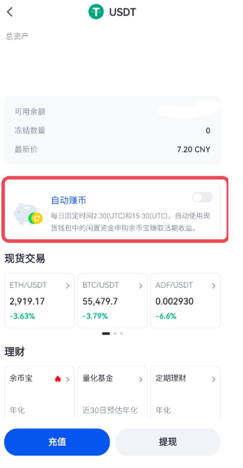 注:开启“自动赚币”后,每日固定时间2:30(UTC)和15:30(UTC),自动使用现货钱包中的闲置资金申购余币宝赚取活期收益。