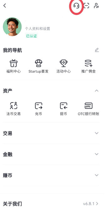 1、打开pi派币app,登录个人账户,点击左上角“头像”,再点击右上角“耳机”图标后,点击“联系客服”。