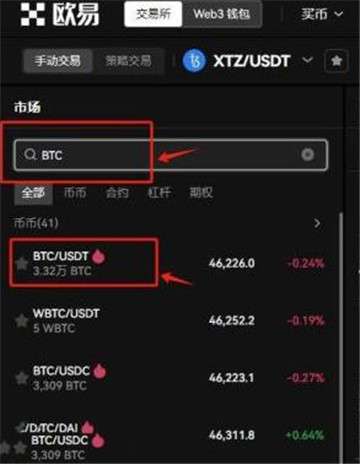 8、在搜索框输入BTC,选择BTC/USDT交易对,可以看到BTC实时行情