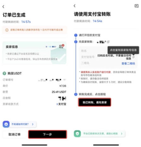 订单确认之后,点击【下一步】;及时打开手机银行App/支付宝/微信,输入对方账户信息进行付款,完成之后,点击【我已转账,通知卖家】。对方核实款项后,您所购买的数字资产就会发放给您,可以在【资产】栏查看。