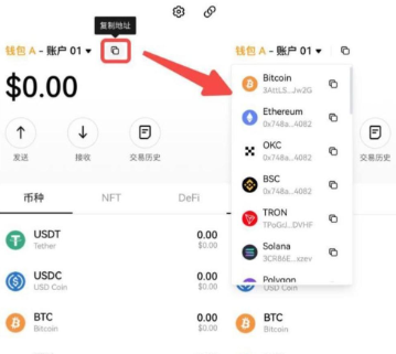 4、点击复制地址图标,,复制到第三步的提现地址处,选择您想交易的网络所对应的钱包地址,转账给该地址即可充币。