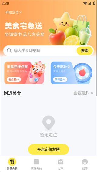 2、开启定位权限即可发现附近的美食,点餐有优惠,还能帮你选择今天吃什么;