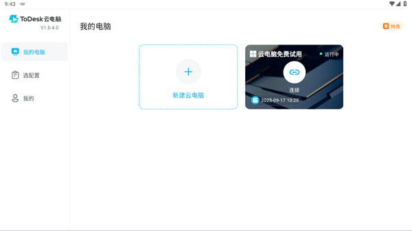 todesk云电脑HD安装最新版本是一款专为安卓平板设备推出的云电脑应用,它不仅更适配平板大屏幕的操作体验,还提供高性能云电竞、AIGC藏宝地两种云电脑体验,其中包含多种高、中、尊享、顶级配置套餐选项,用户可以根据使用需求体验。