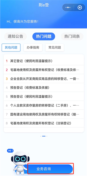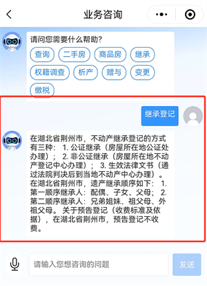 此栏目利用人工智能技术,为群众提供24小时不间断的在线咨询服务,涵盖不动产登记政策解读、流程指导和业务解答。