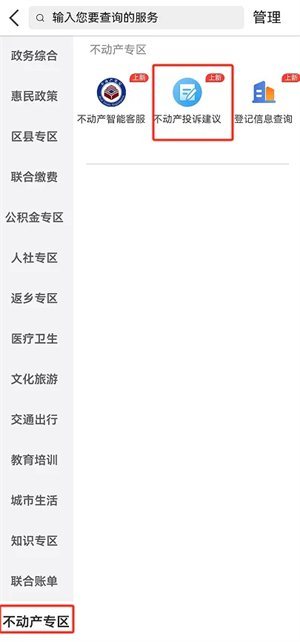 1 在“不动产专区”中选择“不动产投诉建议”