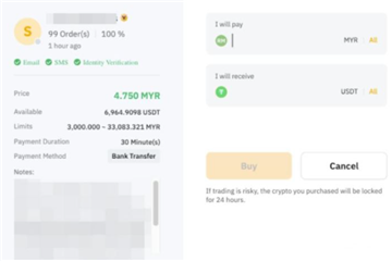 2、在买币页面,您可以根据交易需求输入所需币种、金额、法币、付款方式等条件,筛选广告方。