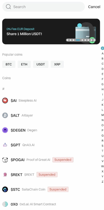 第3步:查看支持充值的币种列表。点击偏好的币种,选择要充值的币种和网络。