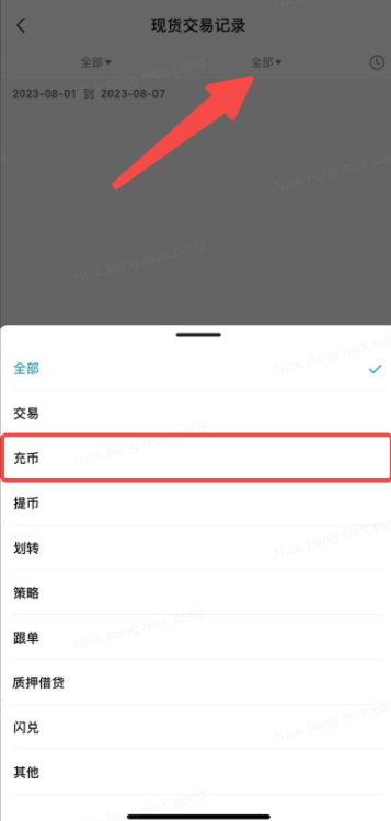 4,选择资产类型,将交易类型筛选为"充币",并选择日期范围;
