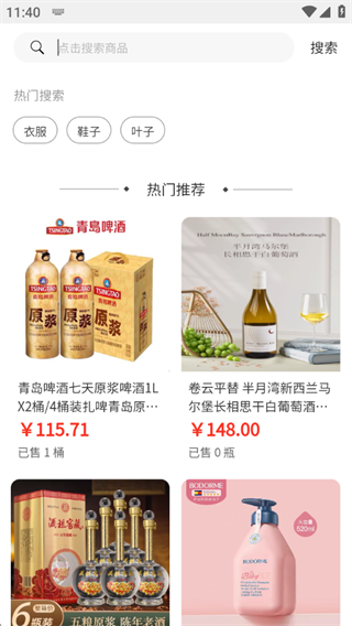 3、可以搜索想要购买的商品,也有一些热门商品推荐;
