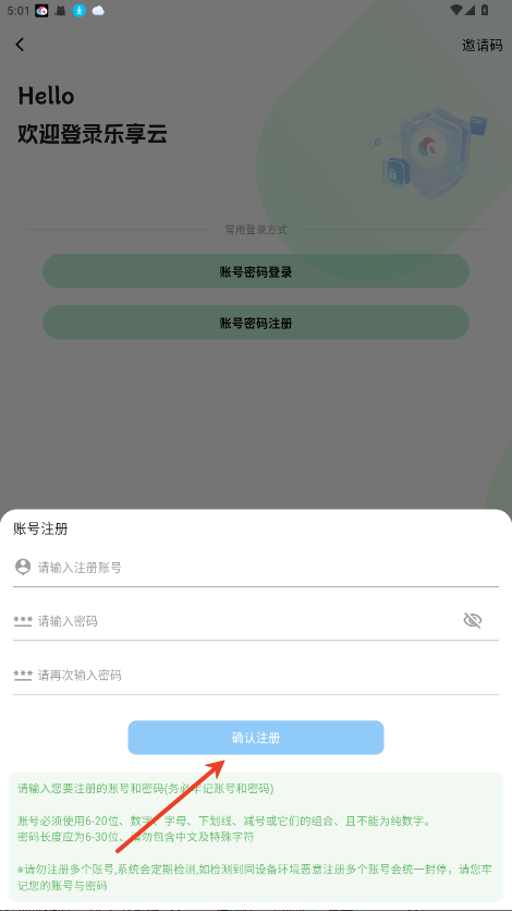 3.输入自定义账号,密码,点击【确认注册】就成功了。