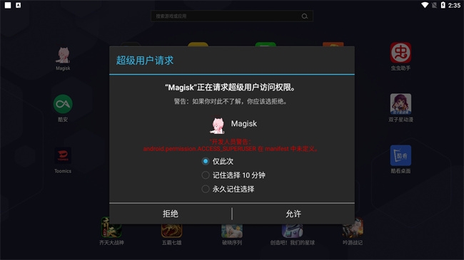 2.赋予设备Root权限,允许执行开发者级操作,同时支持针对性隐藏root,应对部分应用的Root检测。