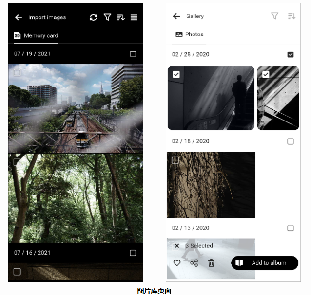在“图片库”页面上,您可以将图像添加到收藏夹、与其他应用程序共享或添加到相册。