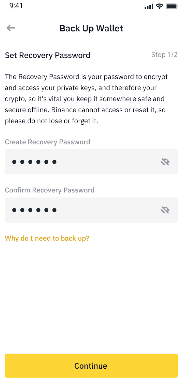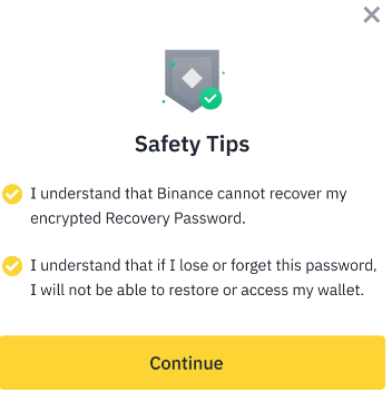 恢复密码用于对密钥分片进行加密。请将其妥善保管在安全位置,切勿向他人透露。如果不幸丢失或遗忘恢复密码,币安无法帮助您找回该密码,届时您将无法访问密钥分片备份和Web3钱包。
