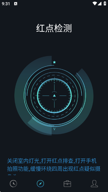 3、切换到红点检测功能,按照提示关闭室内灯光、打开红点排查和手机拍照功能,缓慢环绕四周排查红点疑似摄像头。