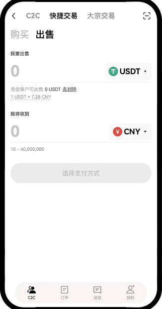 一、打开数字资产钱包首页-点击C2C买币-点击出售-选择需要出售的数字资产 :