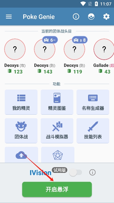 1、在手机上打开PokeGenie软件,在主界面点击“开启悬浮”按钮。