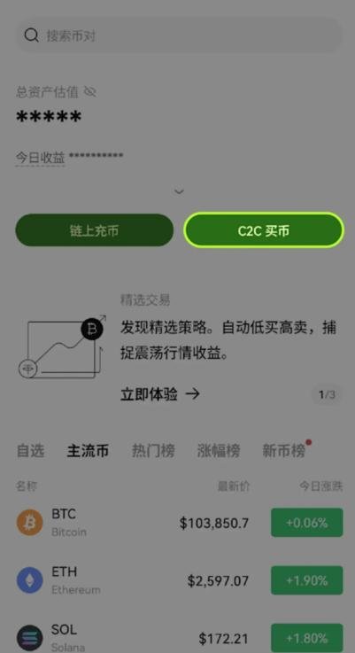 1.打开App后依次点击【C2C买币】-【购买】,选择合适的商家进行交易。