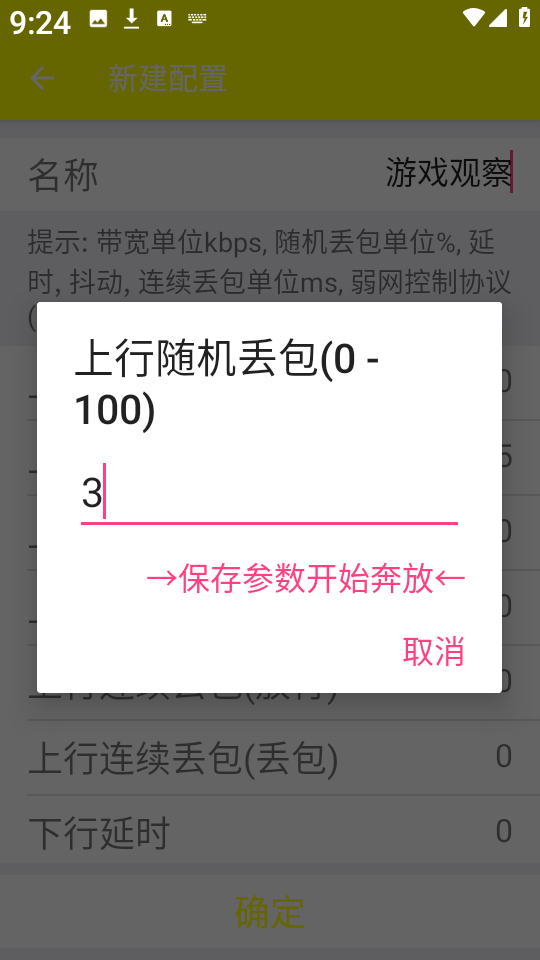 5、然后自定义设置相关弱网参数,点击“保存参数开始奔放”。