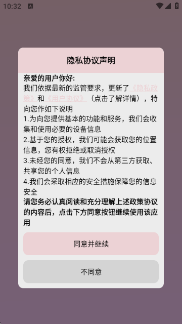 首次打开APP,阅读隐私协议声明后,点击“同意并继续”,进入应用。