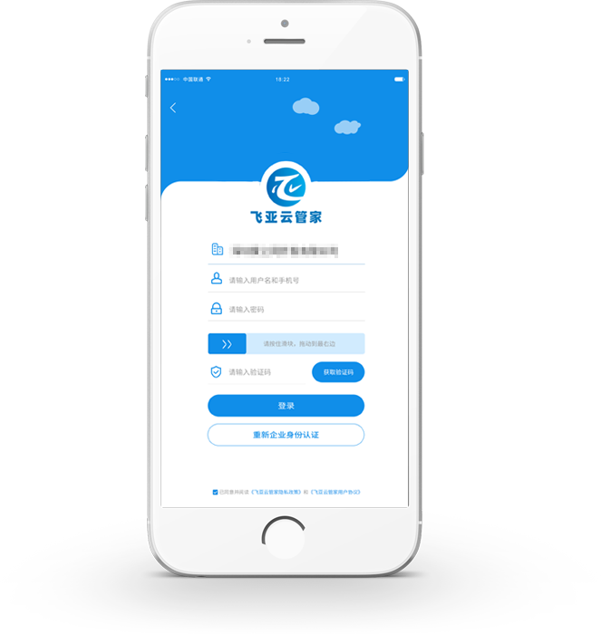 02再次登录飞亚云管家时请输入相关信息并点选已同意并阅读《飞亚云管家隐私政策》和《飞亚云管家用户协议》