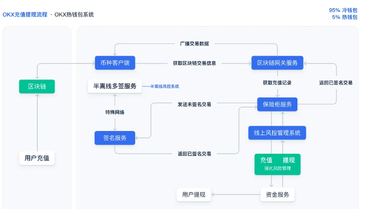 热钱包:OKX 热钱包系统采用多重签名、半离线签名、大数据风控等多重技术手段,保证私钥的安全性。所有用户的充值、提现需求都需要经过多重风险管理认证,才会广播至区块链确认。
