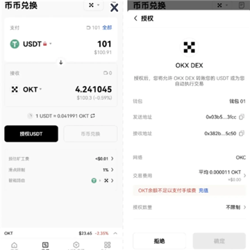 另外,对于未授权或授权额度不足的币种,您须首先点击「授权 」按钮发起授权申请,在钱包中确认并完成授权后,才可进行下一步交易。