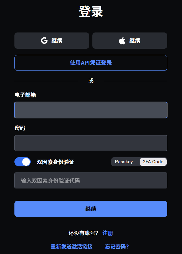 3.注册登录:用户需先在deribit交易所官网进行注册,在获取用户名和密码后方可登录app。