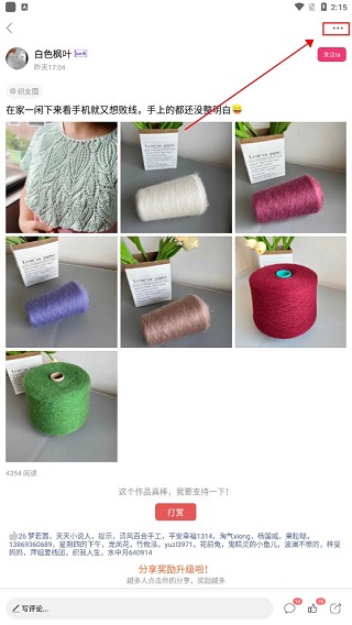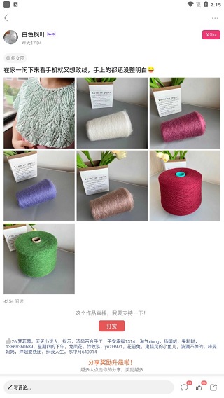 5、回到首页,不同的标签类别下展示了大量手工编织的作品,点击进入,可以关注你喜欢的原创者,可以撰写评论,也可以参与聊天互动,还能点赞、打赏和转发。