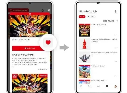 通过点击主页上展示的游戏或周边产品等,可以直接呼出介绍,点击爱心可以将其加入愿望单。