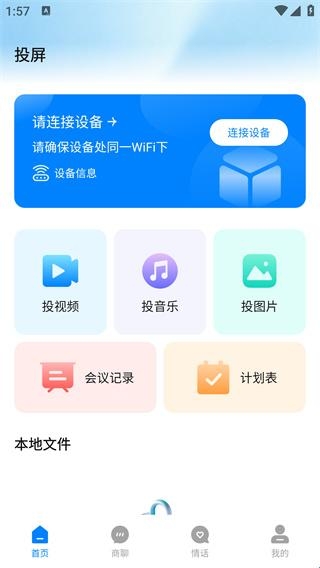 1、打开软件进入首页,就能看到投视频、投音乐、投图片、会议记录等功能,可以随心用。