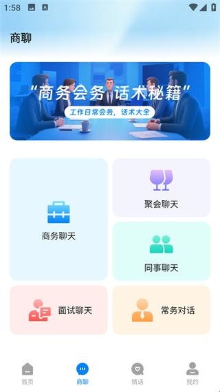 根据需求可自行查找商务、聚会、常务、面试会同时等聊天话术,并能复制使用;