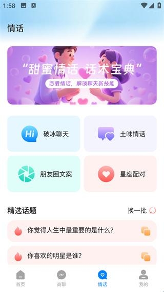4、点击下方工具栏情话,提供很多甜蜜情话模版,方便大家日常使用。