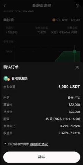 2、先选择方向【看涨/看跌】,然后选择标的币种【BTC/ETH】,最后选择【期限】以及相关的【目标价格,包括基准价和兑换价】