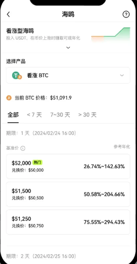 2. 点击 【海鸥】 并选择策略 (看涨/看跌) 和产品币种 (BTC/ETH)