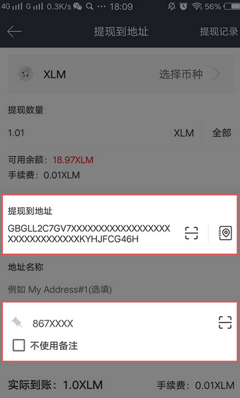 3、点击提现,选择“提现到地址”,进入提现页面,输入您的XLM提币地址,和需要备注的Memo以及提现金额; (注意:不要勾选“不使用备注”)