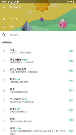 fabulous软件是一款可以帮助你的日常生活更加完美的自律软件,你可以使用这款软件去记录然后完成你所有想做的事情,并且在这款软件中你可以看到很多不同的分类,你可以有规划的计划你要做的任何事,软件中的功能都是比较简单的,同时软件中还有很多内容。