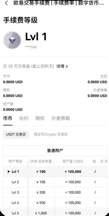 2,下载安装之后,注册登录,然后就可以通过“用户中心 > 个人资料 > 手续费等级”查看手续费等级,包含各交易类型、各币种交易区的手续费率。
