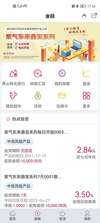 个人理财:定期活期互转、智能通知存款办理、理财产品购买等。
