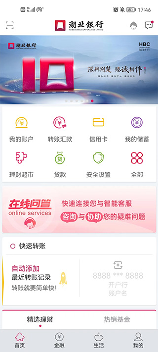 湖北银行手机银行app是专门为湖北银行手机用户量身打造的金融移动服务平台,该应用提供了余额查询、明细查询、账户挂失、密码修改、行内转账、跨行转账、预约转账,在线缴纳水费、电信费、定期活期互转、智能通知存款办理、理财产品购买、查询个人贷款等多项实用功能,并为用户24小时无间断完美服务,是所有湖北银行用户必备的手机app。与此同时,该软件不仅提供了最好的产品和服务,成为您真正的银行,触碰您的指尖,无需来回切换,无需排队等候,无需手持大光卡,任意数量的银行卡轻松在线注册,超低门槛,0手续费,提供全天安全、便捷、高效、专业的网上理财管家服务。除此之外,湖北银行app还推出金融助手功能,无需登录即可轻松查询最新、最实用的金融行情资讯、网点地图、特惠商户、银行公告等信息,为您提供贴心服务,有需要的用户快来下载吧。