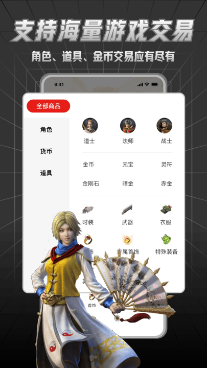 2、支持海量游戏交易:角色、道具、金币交易应有尽有。