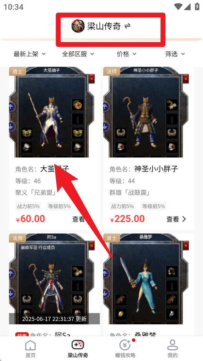 3、点击某一具体游戏名称(如梁山传奇),即可查看该游戏内所有角色商品并进行筛选与浏览。