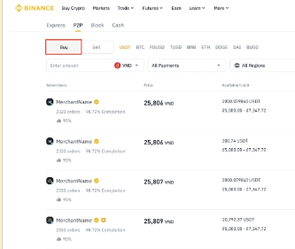 2.1.点击[购买],然后选择您要用于支付的法币。选择您要购买的加密货币。请留意每则广告的可用数量和限制。