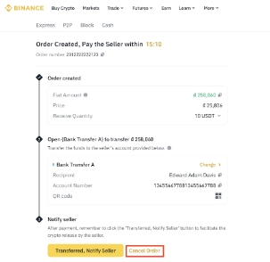 2.如果您要取消订单,请点击[取消订单]。请注意,如果您在一天内取消三笔订单,「买币」将会被停用。选择取消原因,然后点击[确认取消]。