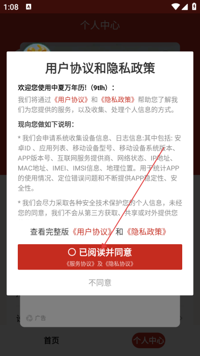 1、打开“中夏万年历”应用,在弹出的【用户协议和隐私政策】窗口勾选【已阅读并同意】。