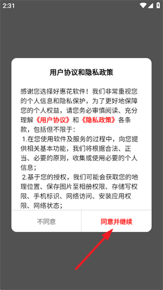 1、首先打开软件,阅读并同意《用户协议》 和 《隐私政策》;