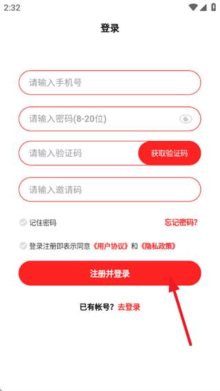 3、输入手机号,设置密码并获取验证码,最后点击“注册并登录”即可。